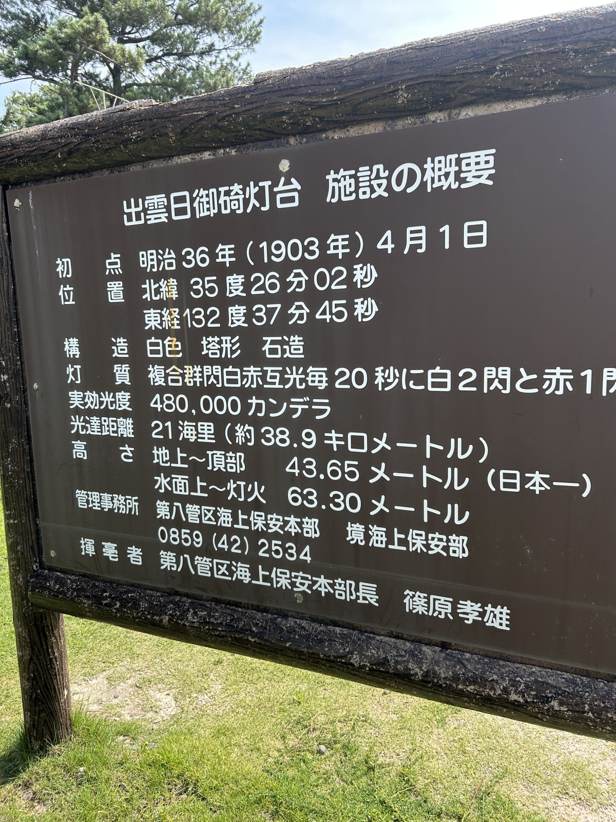 日御碕は島根県を代表する観光地の一つで島根半島の西端に位置し、海岸線は浜あり灘あり、入り江や岬ありと変化に富んでいます。その日御碕には日御碕灯台があり、明治36年に設置され、高さ43.65mと日本一高い石造りの灯台だそうです。