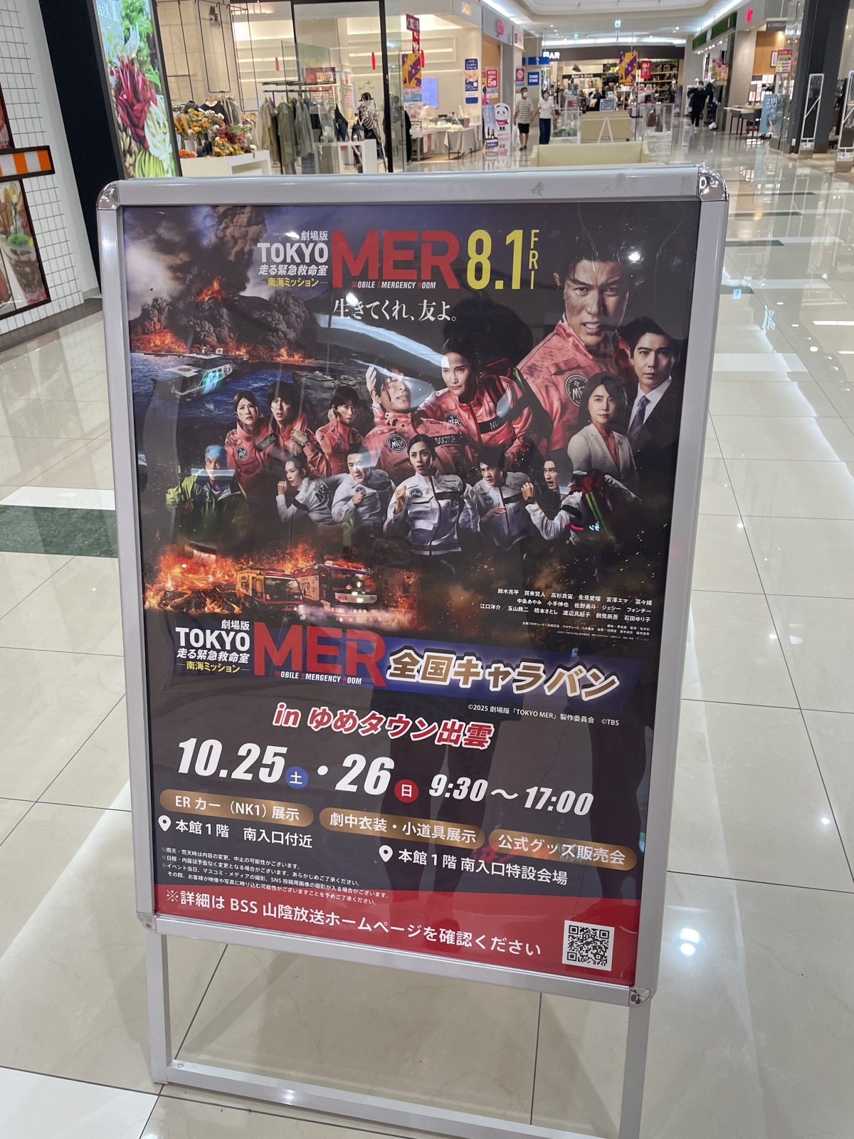 そらIターン女子 会員No.137 2025.10.14 これは! この前、ゆめタウン出雲でこんな看板を見つけました!! 見た瞬間行くと決めました。 MER、ものすごくハマってドラマも最初からしっかり見直して映画も行ったので、このイベントがとても楽しみです! 喜多見チーフもあわよくばきてくれたら、ものすごく嬉しいなと心の片隅で期待しています。 戻る トップへ戻る