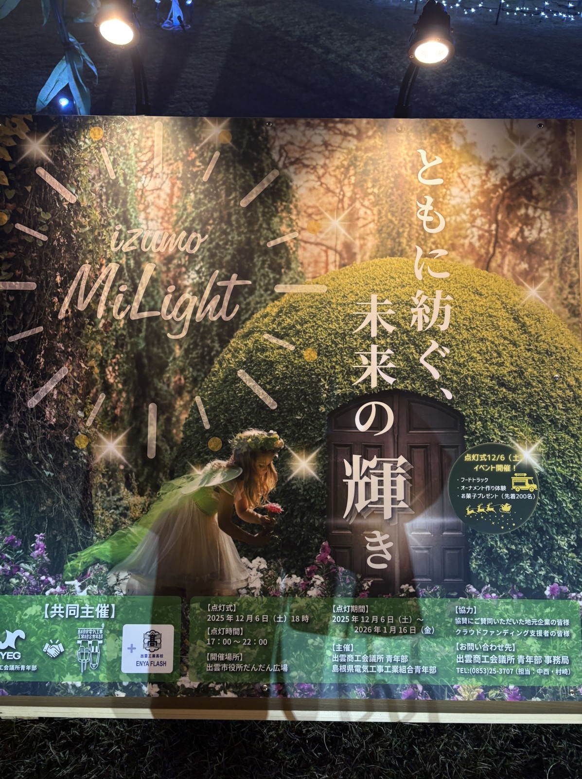 このイベントは出雲市役所だんだん広場で令和2年から行われているようで、今年は12/6〜来年の1/16までライトアップされているそうです。近くを通った際にはまた伺いたいなと思いました!