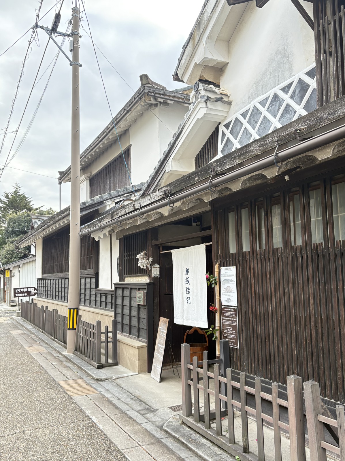 出雲市平田町にある木綿街道は白壁の土蔵や妻入り造りの町屋が並ぶノスタルジックな町並みがとても綺麗でした。木綿街道は宍道湖と日本海に挟まれ、海や山や湖、川と自然に恵まれた場所で、かつては、木綿の栽培が盛んなことで有名だったそうです。1700年代初頭から綿作が始まり、後期からは他国に販売し明治には生糸に転換して紡績工場が出来上がり、工業都市に発展した平田町は、商人町として賑わい、人口も大幅に増えていったそうです。木綿街道を実際に歩くと目にとまる「左桟瓦」や「なまこ壁」、「格子窓」の連なる町屋などが今も残り、昔ながらの建物や老舗の酒屋、醬油屋、和菓子屋なども伝統の味を今でも守り広めているそうです。