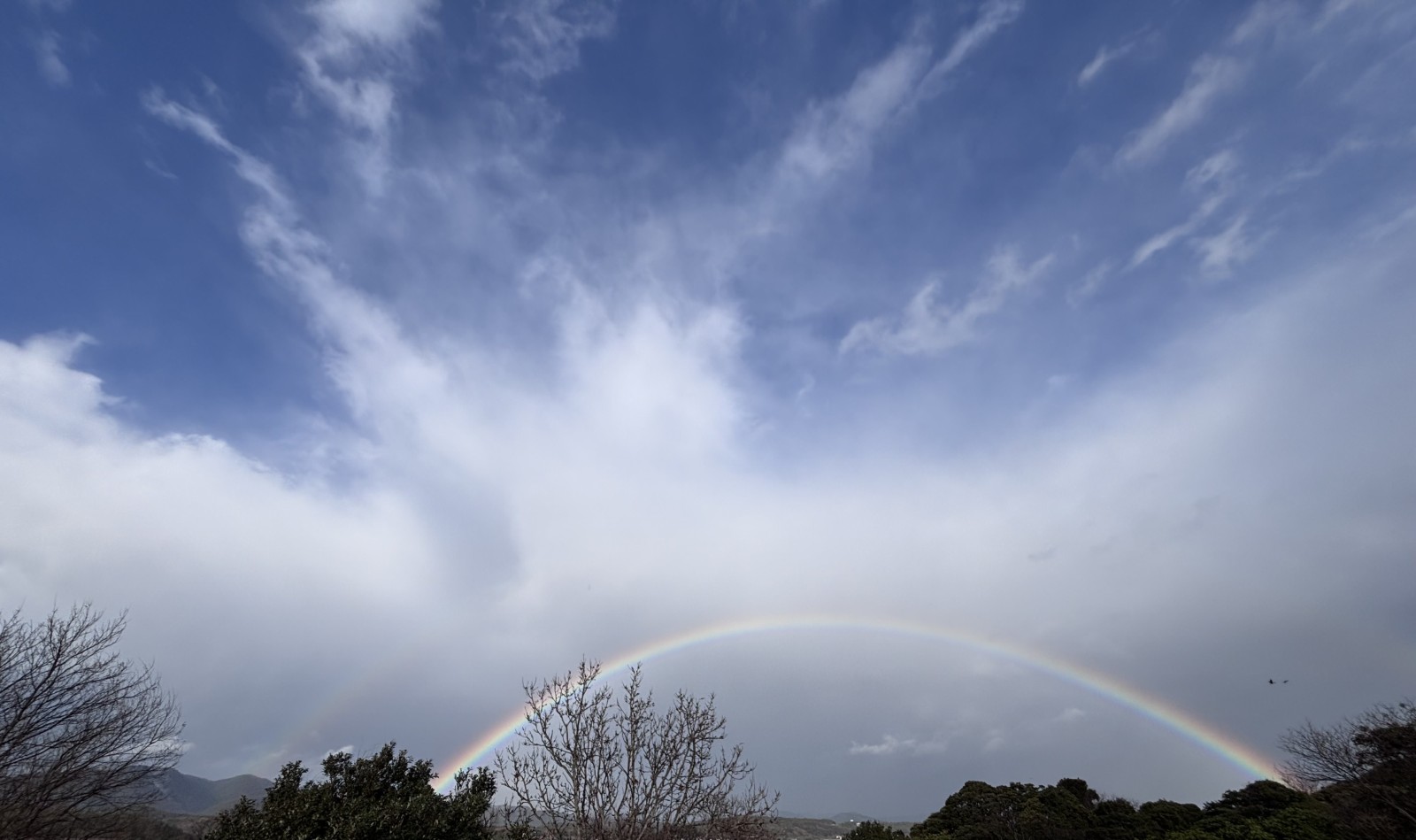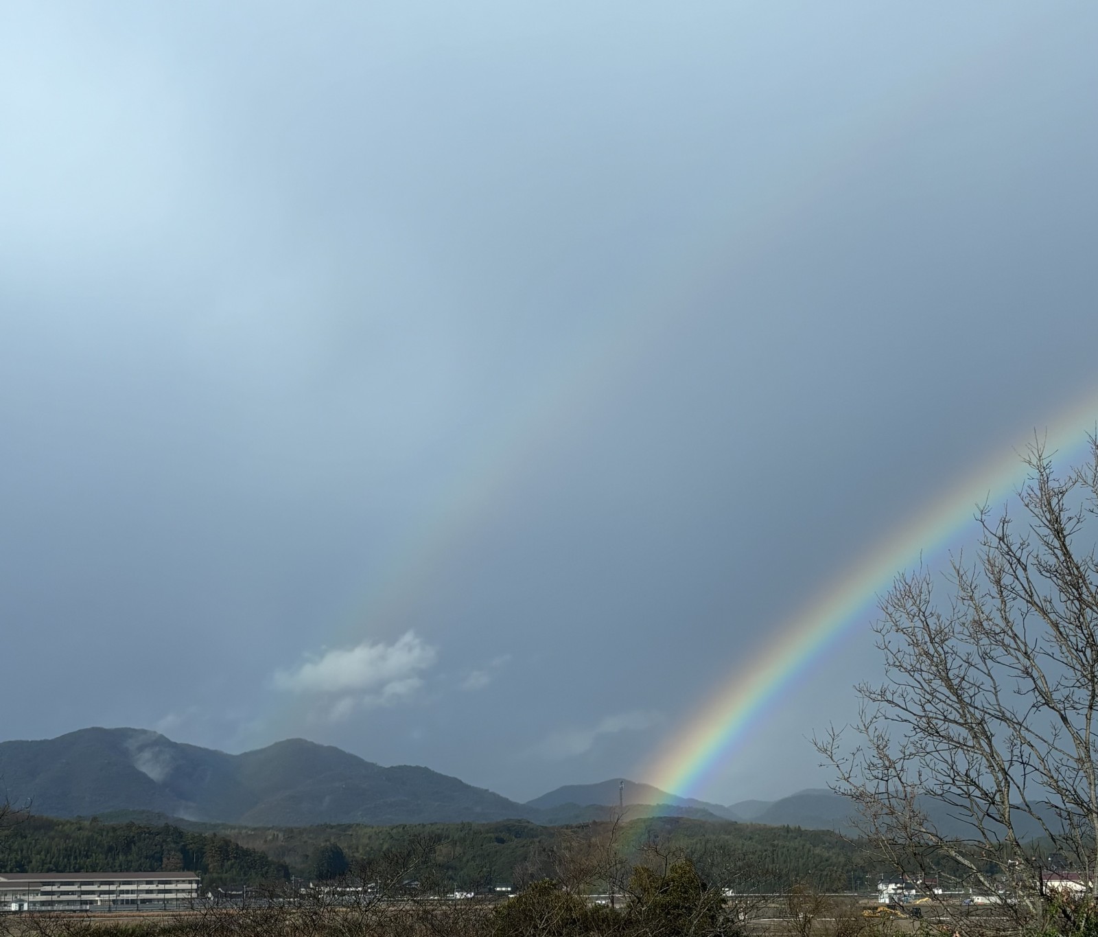 昨日のお昼頃、職場の方から「ダブルの虹が出ている!」と教えていただき、外へ出てみると、目前に七色が美しい内側の虹と、うっすら空に透ける外側の大きな虹からなるダブルレインボーがそびえ立っていました!!