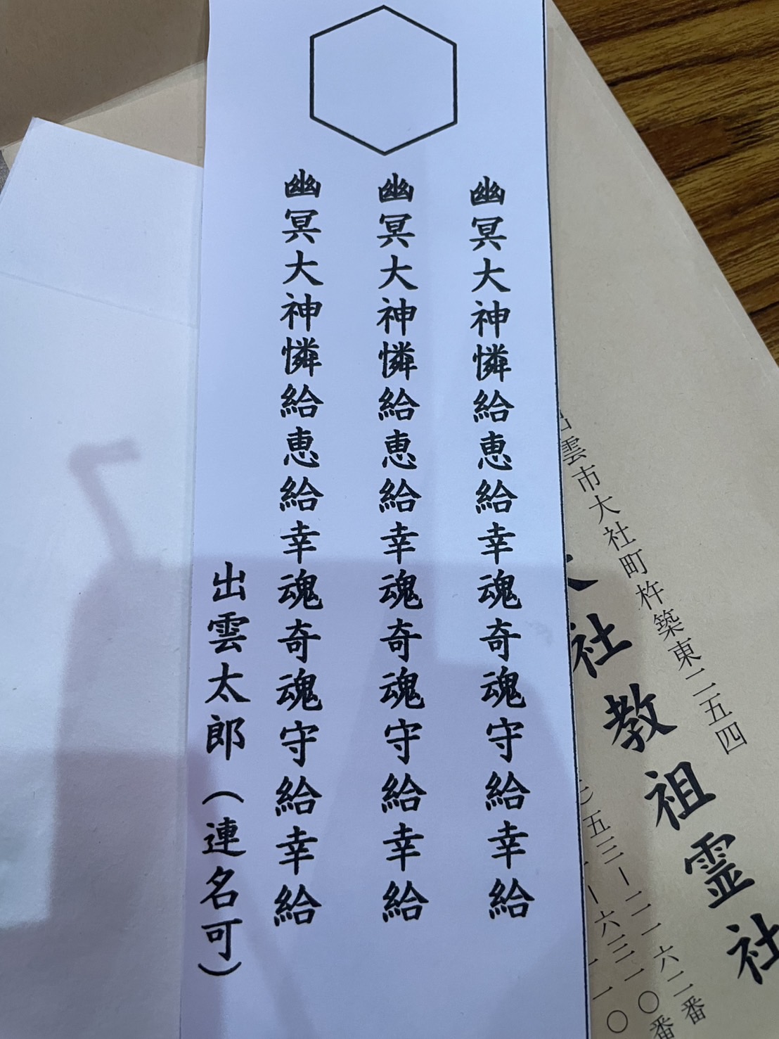写真は、神式の「前夜祭」に参加した人に配られた物で、私も見本を見ながら夜、書かせていただきご遺族に託しました。