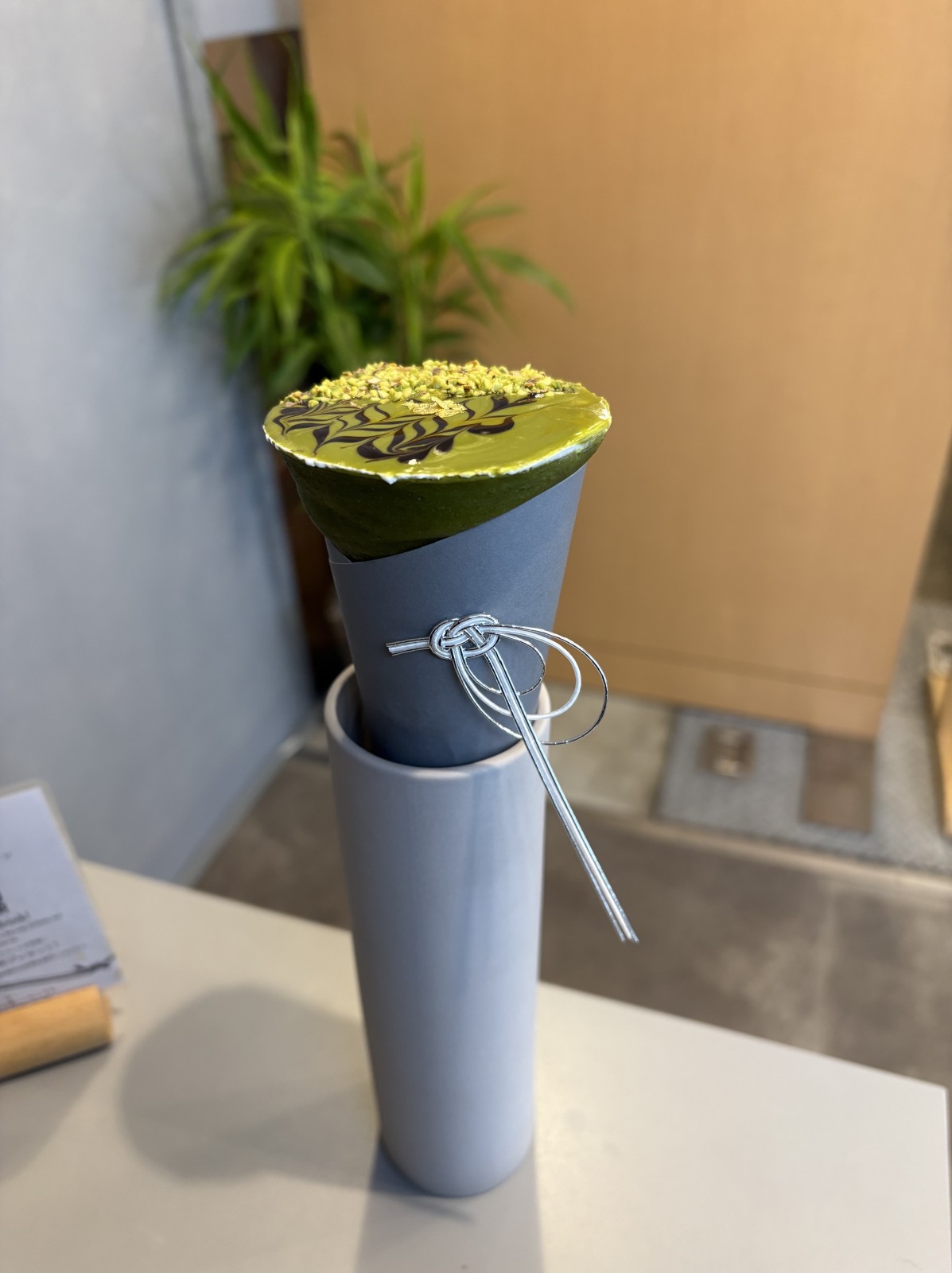 『たばねのし』があるのは出雲大社の神門通り沿い。『一福』前のテラスの一角にあります。縁結びの聖地として有名な『出雲大社』や出雲市のパワースポット巡りに街並み散策をする中で、ちょっと休憩したい、そんな時にピッタリのスイーツ専門店で『たばねのし』の魅力は、なんといってもその美しい見た目と、こだわりの素材で作られた味わい。日本一のお茶生産量を誇る静岡県掛川市の抹茶を使用していて生地はモッチリ感と凄くしっとりしていて、クリームは裏ごしされ滑らかに仕上げてありました。また、クレープの包装紙を飾る水引は職人さんによる手仕事。見た目からも日本らしさを感じられる仕上がりになっていました。
