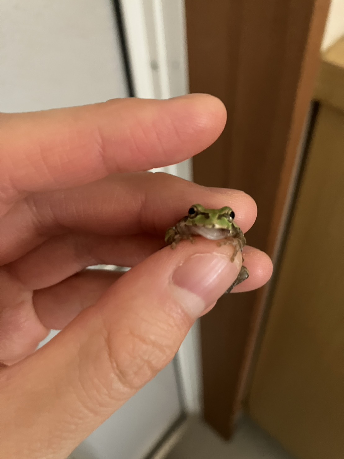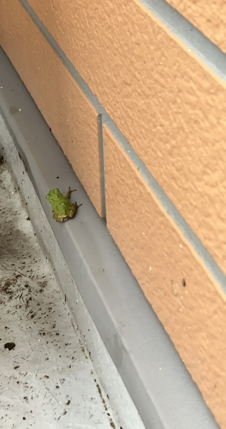 午前中、部屋を掃除していると、ベランダにカエルを発見しました。