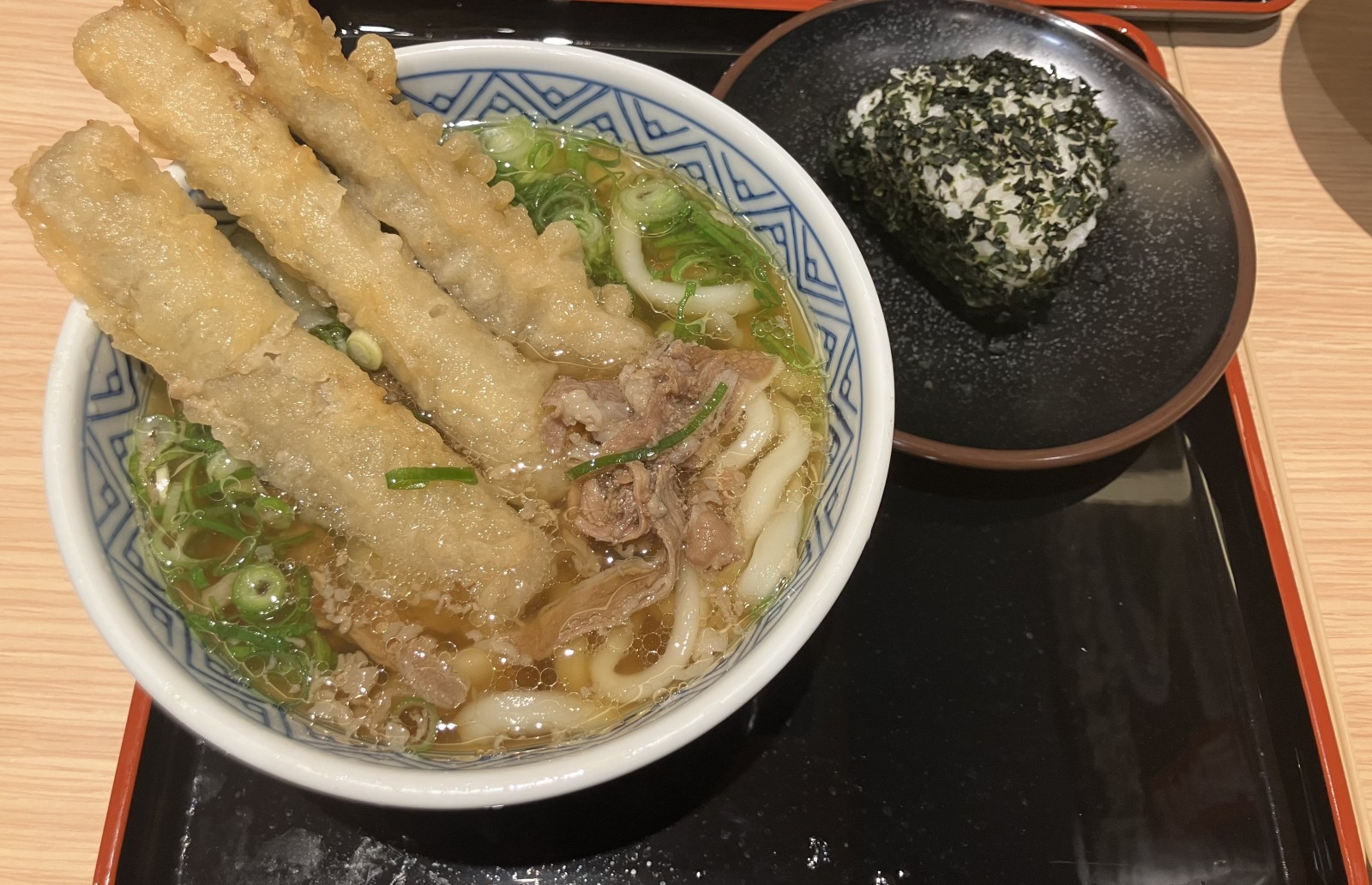 肉ごぼううどんが定番メニューらしく、そちらと山口県萩市で採れたワカメを使ったおむすびを注文しました。うどんは甘い味付けで、ごぼう天はできたてサクサクで味わうもよし、少し浸して汁を吸わせるも良しと大変満足できました。