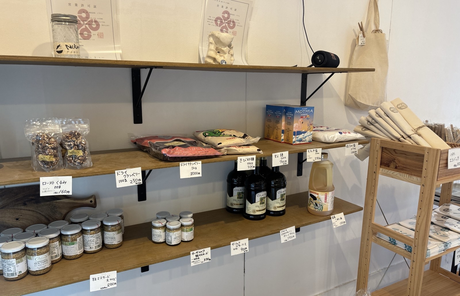 パンの他にエコバッグやボールペン、手ぬぐいもあります。砂糖や塩、ガーリックバターなどの調味料や、ドライクランベリーにくるみもありますよ。