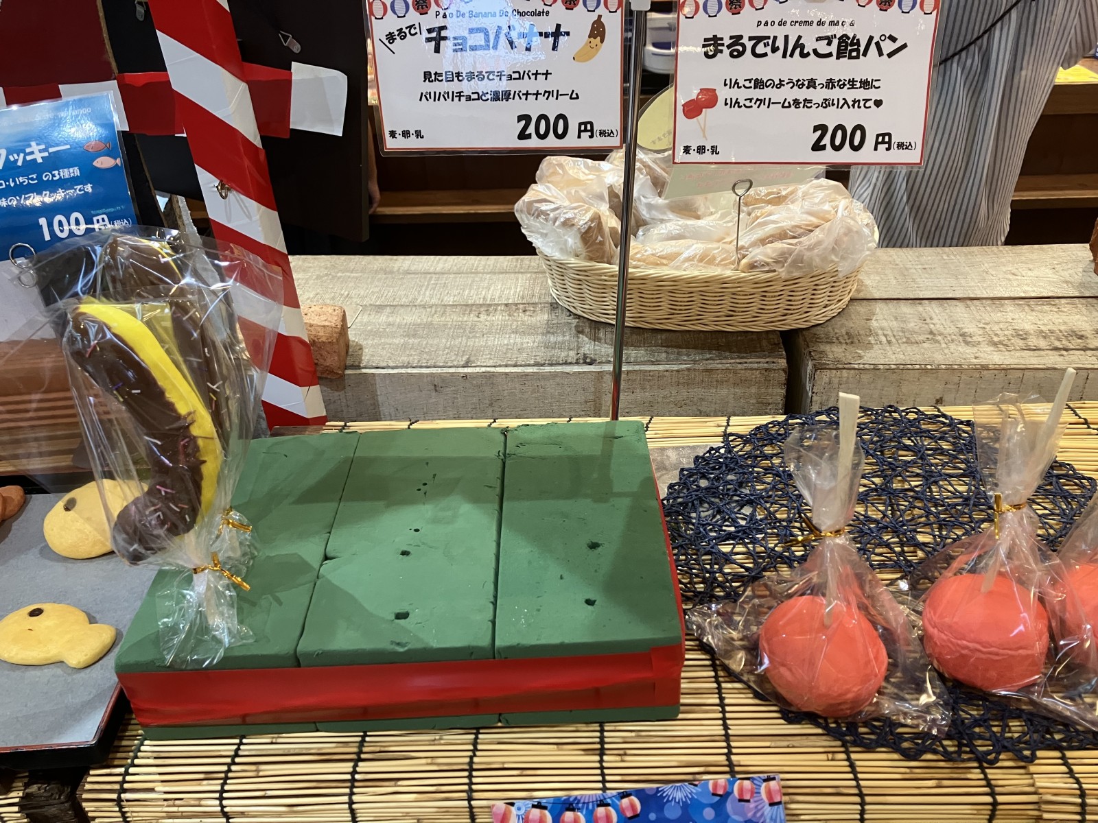 今日森のくまさんに行ったら夏祭りっぽいパンがありました。りんご飴、チョコバナナ、はしまきなどがあって面白かったです。りんご飴パンを買いましたが中にりんごクリームが入っていて味も大変美味しかったです。