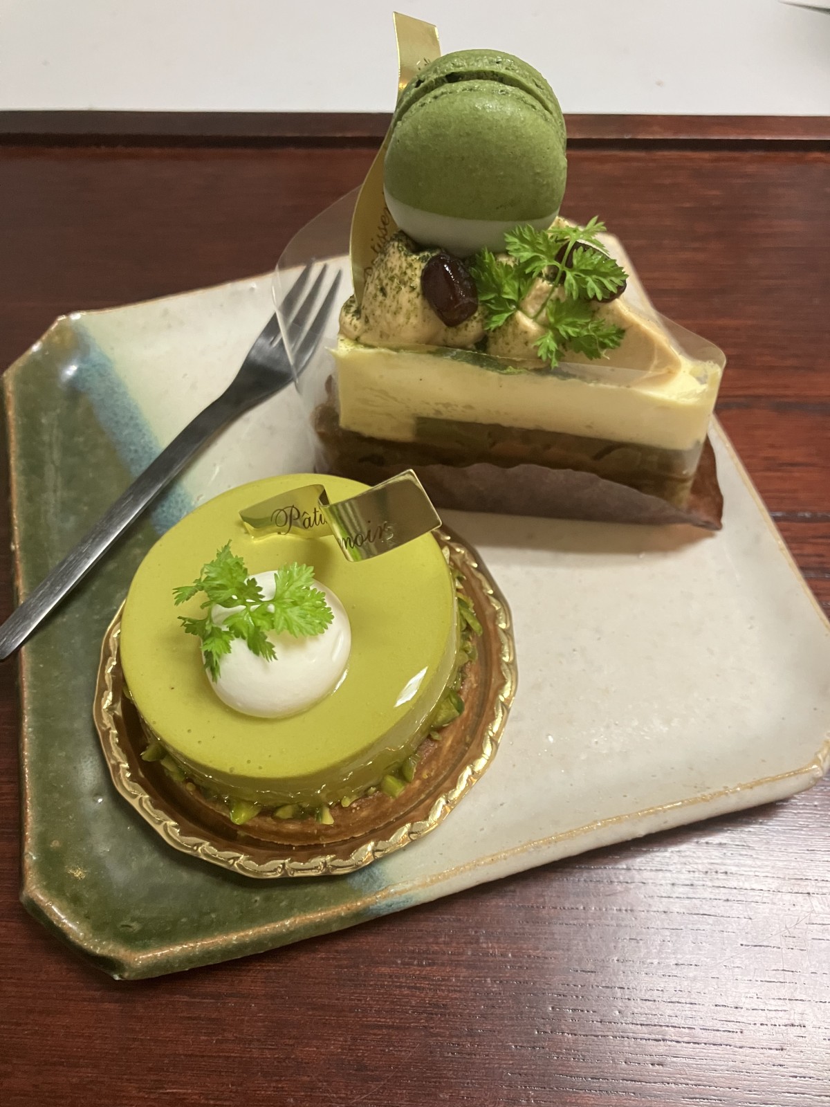 今日はいつもの定番とは違うケーキが出ていたのでそちらの二つにしてみました。奥から小豆と抹茶、手前がピスタチオのケーキです。