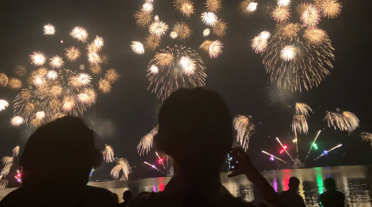 出雲市からすぐ近くの宍道湖上で行われる松江水郷祭花火大会へ両親と出かけました。有料席を予約していたので、湖畔の区画から迫力ある花火を鑑賞出来ました。人出も多く蒸し暑い日でしたが、湖上の風景と相まって特別な雰囲気でした。ドローンショーは初めてで、夜空に映し出す光の演出が凄かったです。