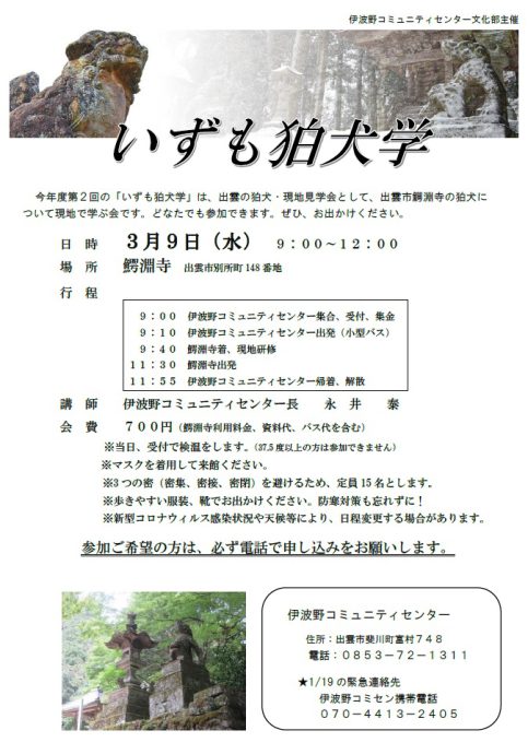 講演・講座 いずも狛犬学 イベント名 いずも狛犬学 開催日時 3月9日(水)9:00~12:00 開催場所 出雲市 鰐淵寺 主催 伊波野コミュニティセンター文化部 問い合わせ 伊波野コミュニティセンター 電話72-1311 添付データ チラシ その他
