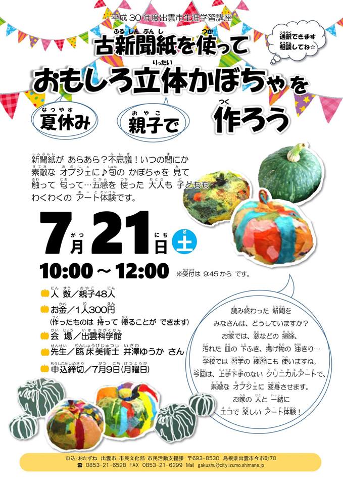 環境 古新聞紙を使って おもしろ立体かぼちゃを作ろう 期日 7月21日(土) 場所 出雲科学館 時間 10:00~12:00 事前申込 要 (詳細は下記サイト) 関係部署 市民活動支援課環境施設課 問合せ 0853-21-6528